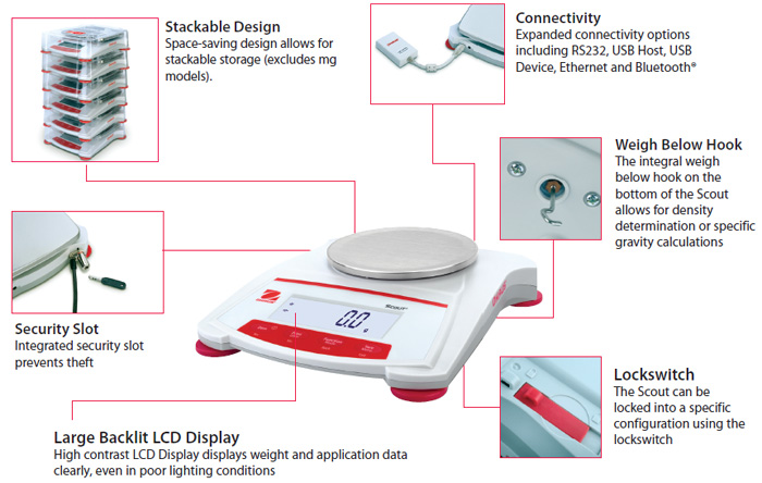 - Einfache 4-Tasten-Bedienung und grosse, hinterleuchtete Anzeige der Scout verbessert die Ablesbarkeit bei schlechten Lichtbedingungen und macht es leichter, die Ergebnisse von der anderen Seite des (Labor-)tisches zu lesen.